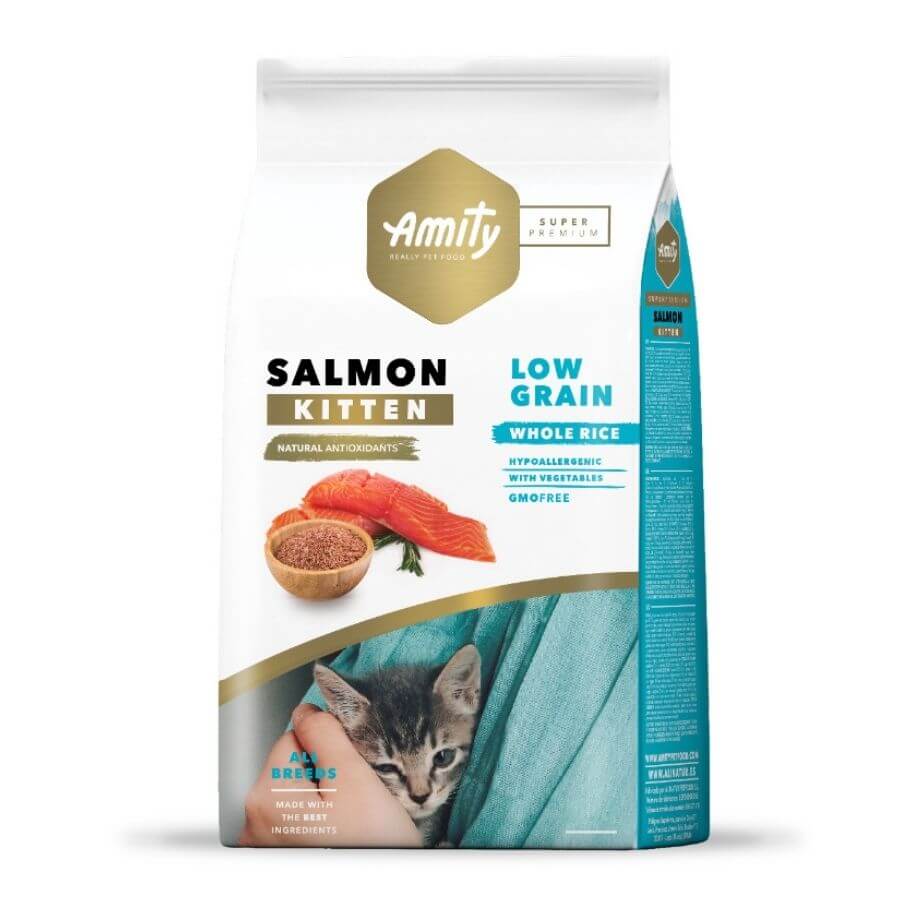 Amity Super Premium Low Grain Salmon Kitten es un alimento natural para gatitos, con carne de salmón deshidratada como primer ingrediente y arroz como único grano. Amity solo utiliza ingredientes naturales, sin colorantes, saborizantes o preservantes artificiales. Su primer componente es carne deshidratada, siendo una excelente fuente de proteína. Amity solo utiliza arroz integral como fuente de carbohidratos y fibra, el cual es un grano noble, de bajo índice glucémico y alergeno.