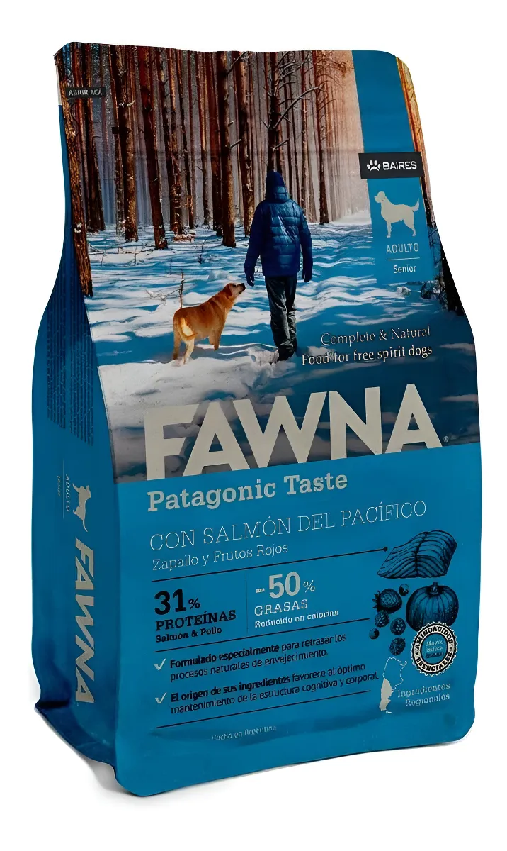 Fawna Patagonic Taste Senior con salmón por 3kg para paladares exigentes es un alimento seco balanceado completo para perros adultos mayores de màs de 7 años meses de edad. Entre sus ingredientes posee salmón del pacífico, zapallo y frutos rojos. También posee un 31% de proteínas tales provenientes del salmón y el pollo, ideal para mantener saludables los músculos, además de un 50% menos de grasas. Su fórmula está especialmente diseñada para retrasar los procesos naturales del envejecimiento, además de contar con los aminoácidos y nutrientes esenciales. También, el origen de sus ingredientes favorece al óptimo mantenimiento de la estructura cognitiva y corporal.