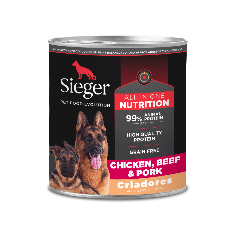 El aporte de proteínas de alta calidad y grasas saludables es clave para el óptimo crecimiento y mantenimiento de las funciones vitales del organismo. Sieger Wet Criadores All in One es un mix de carne de vaca, cerdo y pollo. Lo que aporta un mejor perfil de aminoácidos. Sin cereales, con un 99% de proteína animal, todas las vitaminas y minerales, glucosamina y condroitín sulfato para fortalecer las articulaciones y huesos. La inclusión de taurina contribuye con el correcto funcionamiento del músculo cardíaco. Sieger Criadores Wet se puede agregar al alimento Sieger Criadores Seco, para sumar aún más beneficios funcionales y realzar el sabor o darlo sólo como una nutritiva y deliciosa comida, dado que es un alimento húmedo 100% completo y balanceado para perros de todos los tamaños y edades.