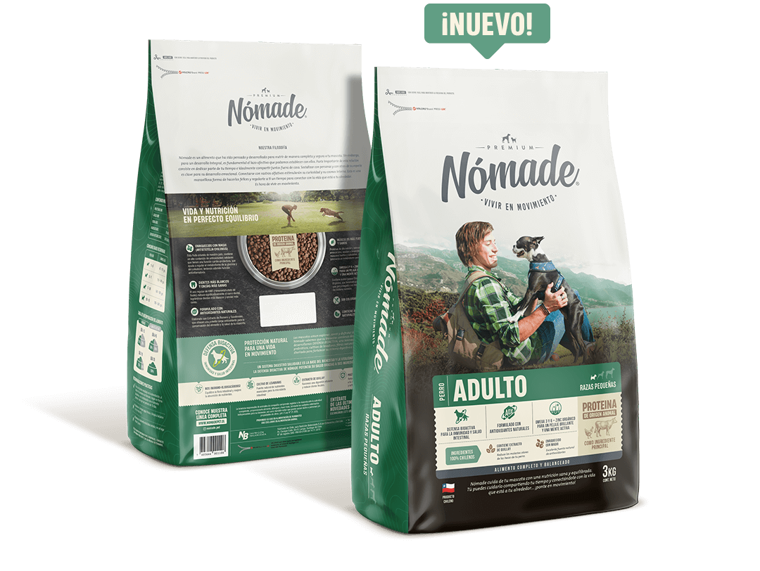 Nómade es un alimento para perros adultos de razas pequeñas desarrollado por expertos en nutrición animal. Un alimento que excede los requerimientos nutricionales de perros adultos, aún de las razas más exigentes, proporcionando una dieta sana y equilibrada para una vida plena, feliz y en movimiento. La DEFENSA BIOACTIVA de Nómade Pet integra ingredientes funcionales que refuerzan el sistema inmune y digestivo, potencian la absorción de nutrientes y mantienen el equilibrio intestinal, promoviendo la vitalidad y bienestar diario de tu perro.