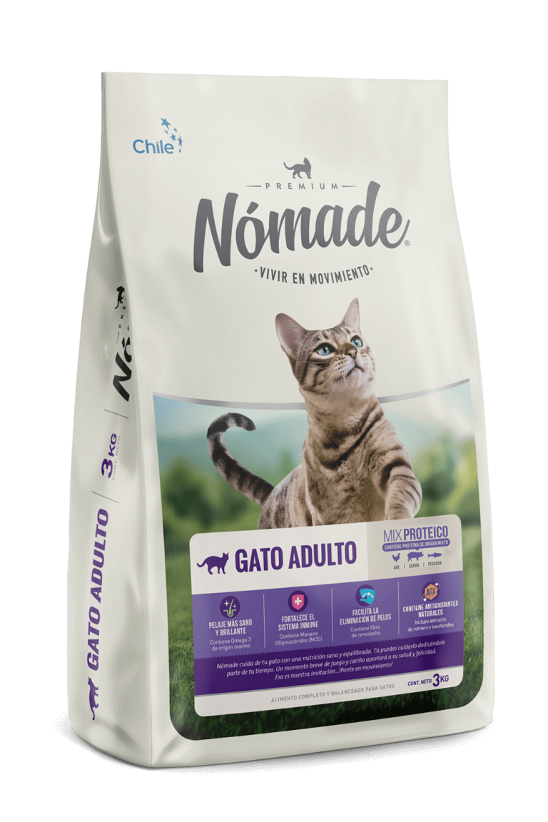 Nómade Gato es un alimento para gatos adultos desarrollado por expertos en nutrición animal. Este alimento está diseñado para satisfacer las necesidades nutricionales de los gatos, proporcionando una dieta sana y equilibrada. La pulpa de remolacha posee una fibra natural moderadamente fermentable que mantiene una adecuada motilidad intestinal, favoreciendo la absorción de nutrientes del alimento y ayuda a eliminar las bolas de pelo que puedan formarse en el intestino, especialmente en los gatos de pelo más largo. Suplementado con Taurina, aminoácido que tiene un importante rol en la función de la vista, corazón y producción de bilis, más aún cuando el gato no es capaz de sintetizar cantidades adecuadas de este aminoácido libre. Contiene HMF (Hexa Meta Fosfato de Sodio), que ayuda a mantener sanas las encías con lo que se obtienen dientes más fuertes y saludables. Contiene Omega 3 y 6, una buena relación de estos ácidos grasos proporcionan un pelaje más sano y brillante además de actuar como reguladores de reacciones inflamatorias e inmuno reguladores. Una correcta relación en la composición mineral del alimento ayuda a mantener un tracto urinario saludable y evitar la formación de cálculos urinarios.